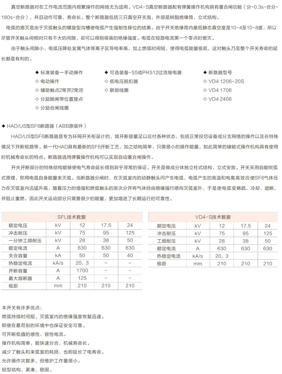 環(huán)網柜的主開關、操作機構及元器件采用ABB公司原裝件或采用進口部件國內組裝生產的SFL-12/24型開關設備,也可根據用戶需要配裝ABB公司原裝HAD/US型SF6。斷路器或VD4-S型真空斷路器。其操作方式分為手動、電動兩種。